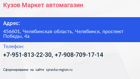 Кузов-Маркет, автомагазин по адресу 456601, Челябинская область, Челябинск, проспект Победы, 4а в дальнейшем Организация, размещена в следующих категориях: