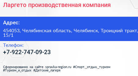 Ларгето, производственная компания по адресу 454053, Челябинская область, Челябинск, Троицкий тракт, 15/1 в дальнейшем Организация, размещена в следующих категориях: