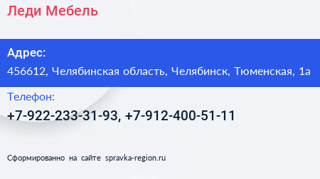 Леди-Мебель по адресу 456612, Челябинская область, Челябинск, Тюменская, 1а в дальнейшем Организация, размещена в следующих категориях: