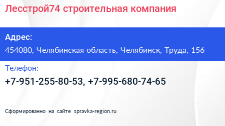 Лесстрой74, строительная компания по адресу 454080, Челябинская область, Челябинск, Труда, 156 в дальнейшем Организация, размещена в следующих категориях: