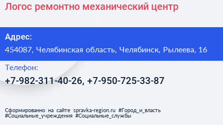 Логос, ремонтно-механический центр по адресу 454087, Челябинская область, Челябинск, Рылеева, 16 в дальнейшем Организация, размещена в следующих категориях:
