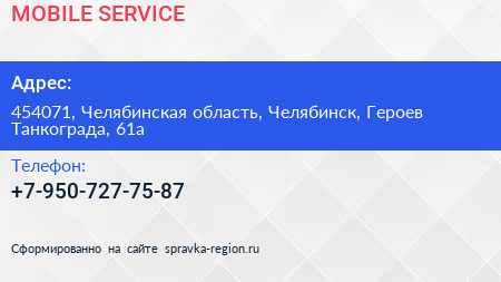 MOBILE SERVICE по адресу 454071, Челябинская область, Челябинск, Героев Танкограда, 61а в дальнейшем Организация, размещена в следующих категориях:
