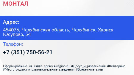 МОНТАЛ по адресу 454076, Челябинская область, Челябинск, Хариса Юсупова, 54 в дальнейшем Организация, размещена в следующих категориях: