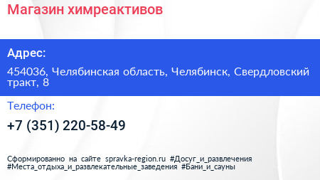 Магазин химреактивов по адресу 454036, Челябинская область, Челябинск, Свердловский тракт, 8 в дальнейшем Организация, размещена в следующих категориях: