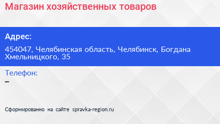 Магазин хозяйственных товаров по адресу 454047, Челябинская область, Челябинск, Богдана Хмельницкого, 35 в дальнейшем Организация, размещена в следующих категориях: