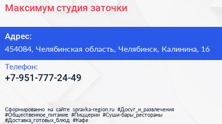 Максимум, студия заточки по адресу 454084, Челябинская область, Челябинск, Калинина, 16 в дальнейшем Организация, размещена в следующих категориях: