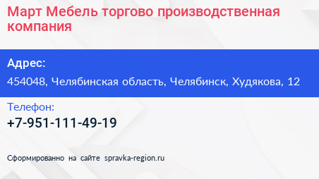 Март Мебель, торгово-производственная компания по адресу 454048, Челябинская область, Челябинск, Худякова, 12 в дальнейшем Организация, размещена в следующих категориях: