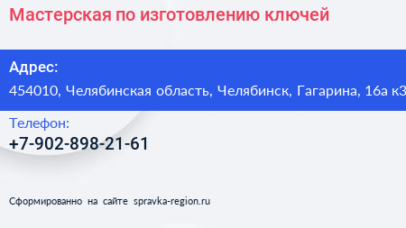 Мастерская по изготовлению ключей по адресу 454010, Челябинская область, Челябинск, Гагарина, 16а к3 в дальнейшем Организация, размещена в следующих категориях: