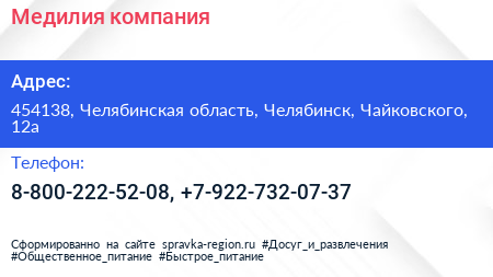 Медилия, компания по адресу 454138, Челябинская область, Челябинск, Чайковского, 12а в дальнейшем Организация, размещена в следующих категориях: