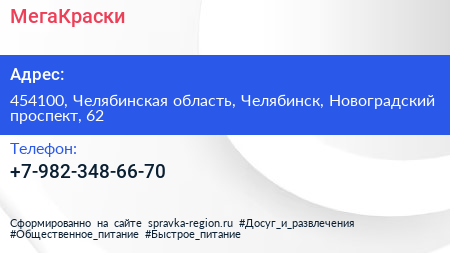 МегаКраски по адресу 454100, Челябинская область, Челябинск, Новоградский проспект, 62 в дальнейшем Организация, размещена в следующих категориях:
