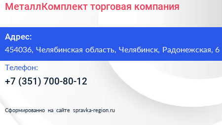 МеталлКомплект, торговая компания по адресу 454036, Челябинская область, Челябинск, Радонежская, 6 в дальнейшем Организация, размещена в следующих категориях: