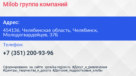 Milob, группа компаний по адресу 454136, Челябинская область, Челябинск, Молодогвардейцев, 37Б в дальнейшем Организация, размещена в следующих категориях:
