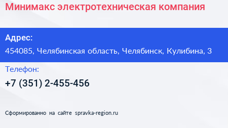 Минимакс, электротехническая компания по адресу 454085, Челябинская область, Челябинск, Кулибина, 3 в дальнейшем Организация, размещена в следующих категориях: