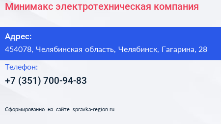 Минимакс, электротехническая компания по адресу 454078, Челябинская область, Челябинск, Гагарина, 28 в дальнейшем Организация, размещена в следующих категориях: