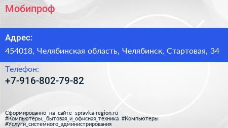 Мобипроф по адресу 454018, Челябинская область, Челябинск, Стартовая, 34 в дальнейшем Организация, размещена в следующих категориях: