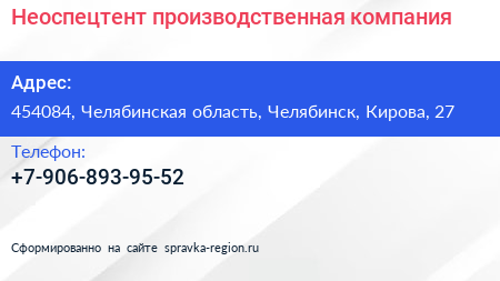 Неоспецтент, производственная компания по адресу 454084, Челябинская область, Челябинск, Кирова, 27 в дальнейшем Организация, размещена в следующих категориях: