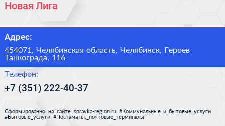 Новая Лига по адресу 454071, Челябинская область, Челябинск, Героев Танкограда, 116 в дальнейшем Организация, размещена в следующих категориях: