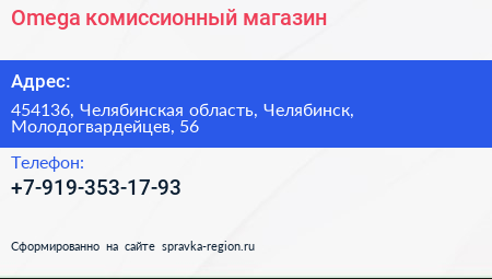 Omega, комиссионный магазин по адресу 454136, Челябинская область, Челябинск, Молодогвардейцев, 56 в дальнейшем Организация, размещена в следующих категориях: