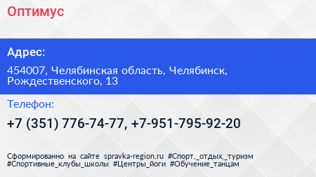 Оптимус по адресу 454007, Челябинская область, Челябинск, Рождественского, 13 в дальнейшем Организация, размещена в следующих категориях: