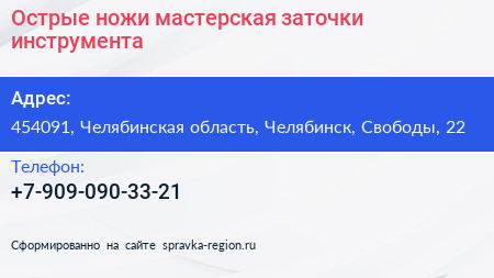Острые ножи, мастерская заточки инструмента по адресу 454091, Челябинская область, Челябинск, Свободы, 22 в дальнейшем Организация, размещена в следующих категориях: