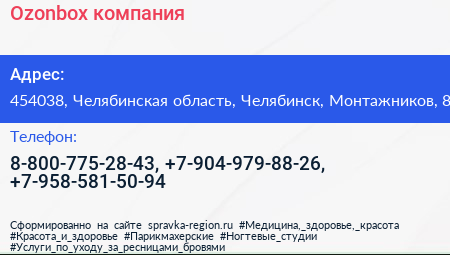 Ozonbox, компания по адресу 454038, Челябинская область, Челябинск, Монтажников, 8 в дальнейшем Организация, размещена в следующих категориях: