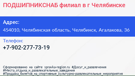 ПОДШИПНИКСНАБ, филиал в г. Челябинске по адресу 454010, Челябинская область, Челябинск, Агалакова, 36 в дальнейшем Организация, размещена в следующих категориях: