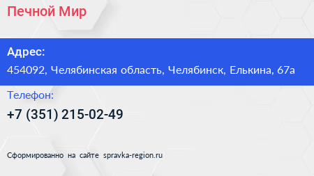 Печной Мир по адресу 454092, Челябинская область, Челябинск, Елькина, 67а в дальнейшем Организация, размещена в следующих категориях: