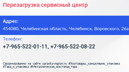 Перезагрузка, сервисный центр по адресу 454080, Челябинская область, Челябинск, Воровского, 26а в дальнейшем Организация, размещена в следующих категориях: