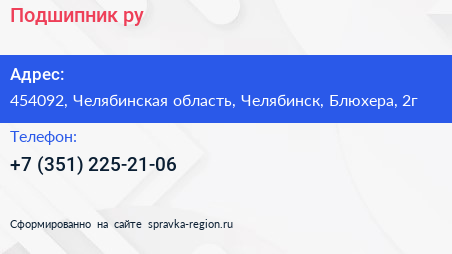 Подшипник.ру по адресу 454092, Челябинская область, Челябинск, Блюхера, 2г в дальнейшем Организация, размещена в следующих категориях: