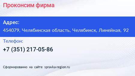 Для связи с организацией воспользуйтесь номером телефона: +7 (351) 217-05-86. Пн: c 08:00-18:00, Вт: c 08:00-18:00, Ср: c 08:00-18:00, Чт: c 08:00-18:00, Пт: c 08:00-18:00, Сб: выходной, Вс: выходной, вы можете обратиться в эту организацию.