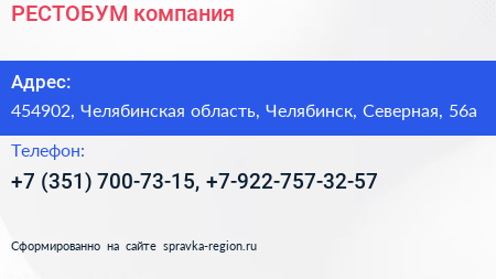 РЕСТОБУМ, компания по адресу 454902, Челябинская область, Челябинск, Северная, 56а в дальнейшем Организация, размещена в следующих категориях: