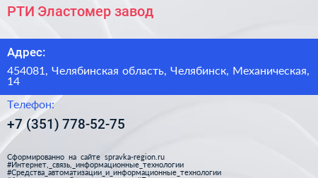 РТИ Эластомер, завод по адресу 454081, Челябинская область, Челябинск, Механическая, 14 в дальнейшем Организация, размещена в следующих категориях: