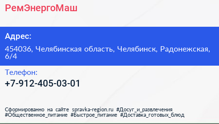 РемЭнергоМаш по адресу 454036, Челябинская область, Челябинск, Радонежская, 6/4 в дальнейшем Организация, размещена в следующих категориях: