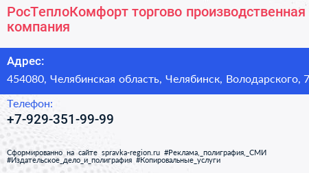 РосТеплоКомфорт, торгово-производственная компания по адресу 454080, Челябинская область, Челябинск, Володарского, 7 в дальнейшем Организация, размещена в следующих категориях: