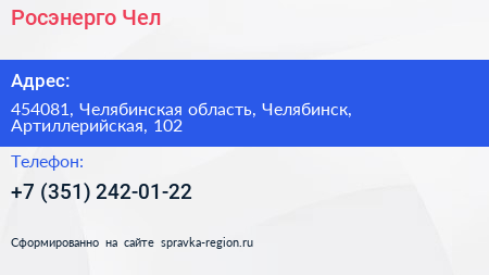 Росэнерго-Чел по адресу 454081, Челябинская область, Челябинск, Артиллерийская, 102 в дальнейшем Организация, размещена в следующих категориях: