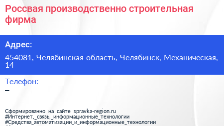 Россвая, производственно-строительная фирма по адресу 454081, Челябинская область, Челябинск, Механическая, 14 в дальнейшем Организация, размещена в следующих категориях: