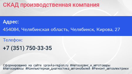 СКАД, производственная компания по адресу 454084, Челябинская область, Челябинск, Кирова, 27 в дальнейшем Организация, размещена в следующих категориях: