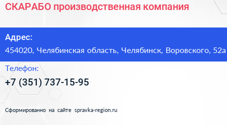 СКАРАБО, производственная компания по адресу 454020, Челябинская область, Челябинск, Воровского, 52а в дальнейшем Организация, размещена в следующих категориях: