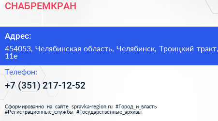 СНАБРЕМКРАН по адресу 454053, Челябинская область, Челябинск, Троицкий тракт, 11е в дальнейшем Организация, размещена в следующих категориях: