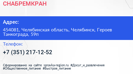 СНАБРЕМКРАН по адресу 454081, Челябинская область, Челябинск, Героев Танкограда, 59п в дальнейшем Организация, размещена в следующих категориях: