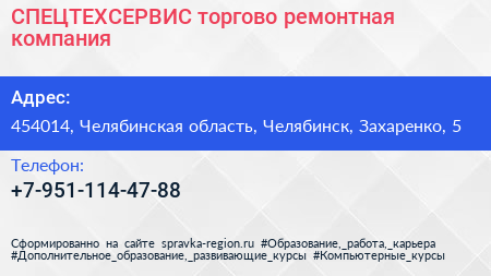 СПЕЦТЕХСЕРВИС, торгово-ремонтная компания по адресу 454014, Челябинская область, Челябинск, Захаренко, 5 в дальнейшем Организация, размещена в следующих категориях:
