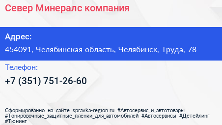 Север Минералс, компания по адресу 454091, Челябинская область, Челябинск, Труда, 78 в дальнейшем Организация, размещена в следующих категориях: