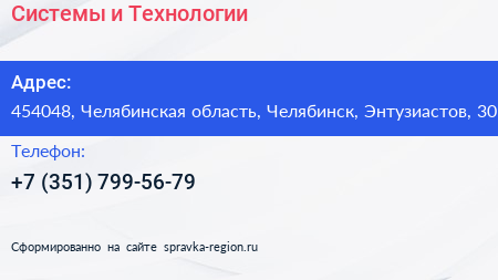 Системы и Технологии по адресу 454048, Челябинская область, Челябинск, Энтузиастов, 30 в дальнейшем Организация, размещена в следующих категориях:
