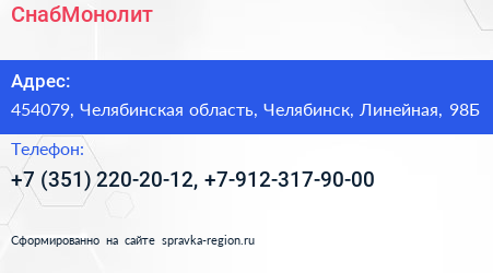 СнабМонолит по адресу 454079, Челябинская область, Челябинск, Линейная, 98Б в дальнейшем Организация, размещена в следующих категориях: