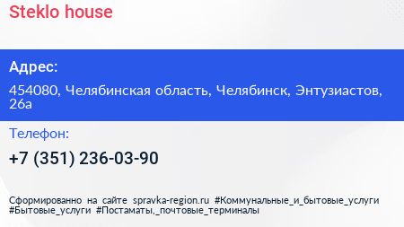 Steklo house по адресу 454080, Челябинская область, Челябинск, Энтузиастов, 26а в дальнейшем Организация, размещена в следующих категориях: