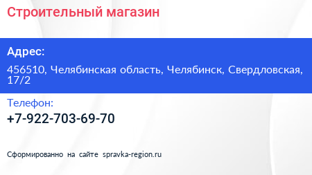 Строительный магазин по адресу 456510, Челябинская область, Челябинск, Свердловская, 17/2 в дальнейшем Организация, размещена в следующих категориях: