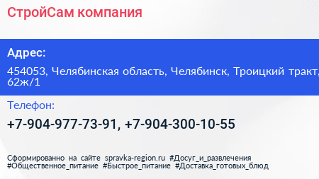 СтройСам, компания по адресу 454053, Челябинская область, Челябинск, Троицкий тракт, 62ж/1 в дальнейшем Организация, размещена в следующих категориях: