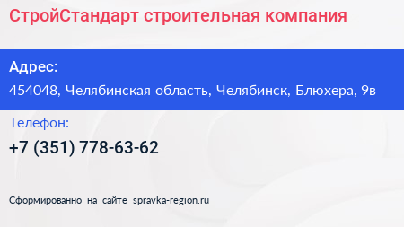 СтройСтандарт, строительная компания по адресу 454048, Челябинская область, Челябинск, Блюхера, 9в в дальнейшем Организация, размещена в следующих категориях: