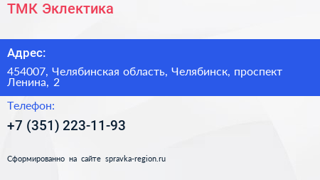 ТМК Эклектика по адресу 454007, Челябинская область, Челябинск, проспект Ленина, 2 в дальнейшем Организация, размещена в следующих категориях: