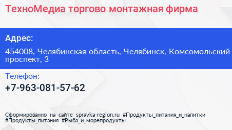 ТехноМедиа, торгово-монтажная фирма по адресу 454008, Челябинская область, Челябинск, Комсомольский проспект, 3 в дальнейшем Организация, размещена в следующих категориях: